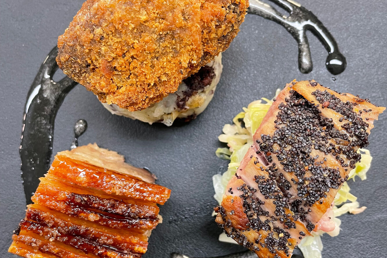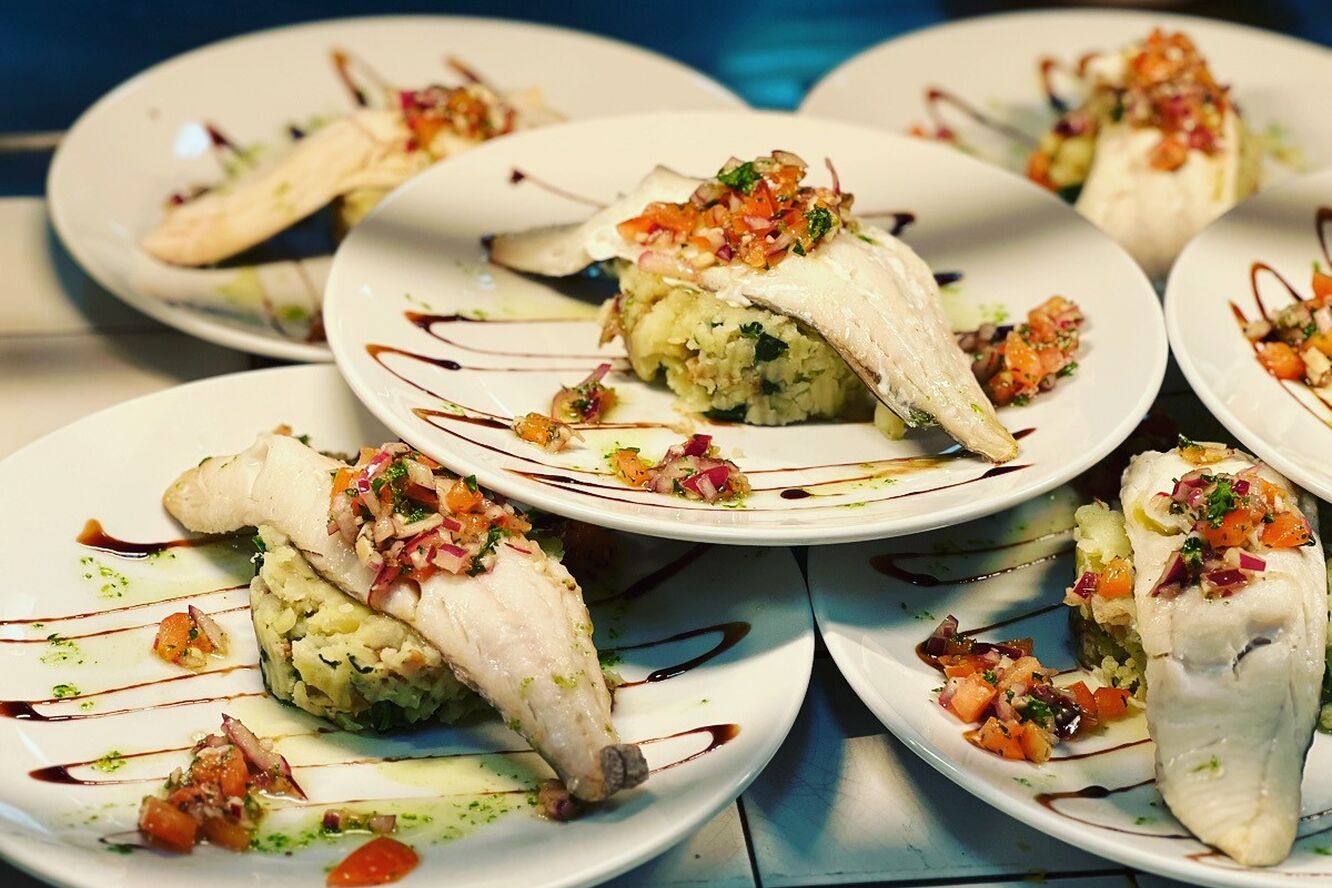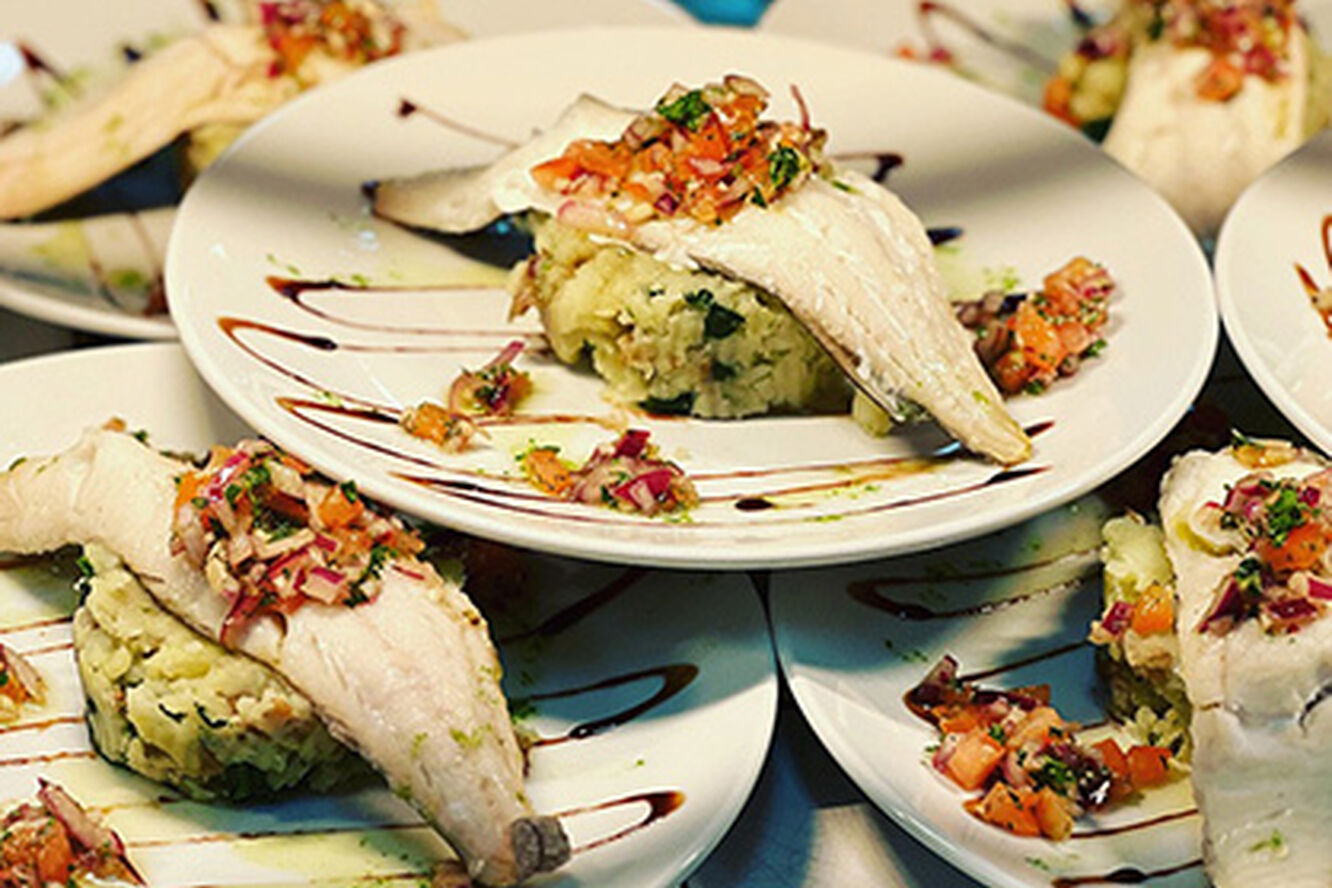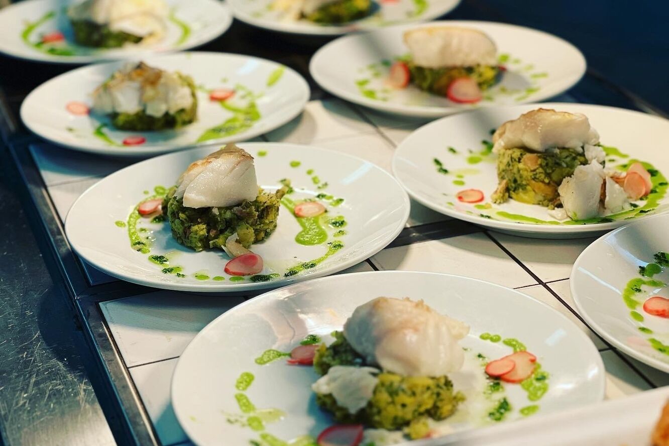 02 Brined cod on a bed of crushed new potatoes and spinach pickled radish pea puree lemon and parsley oil