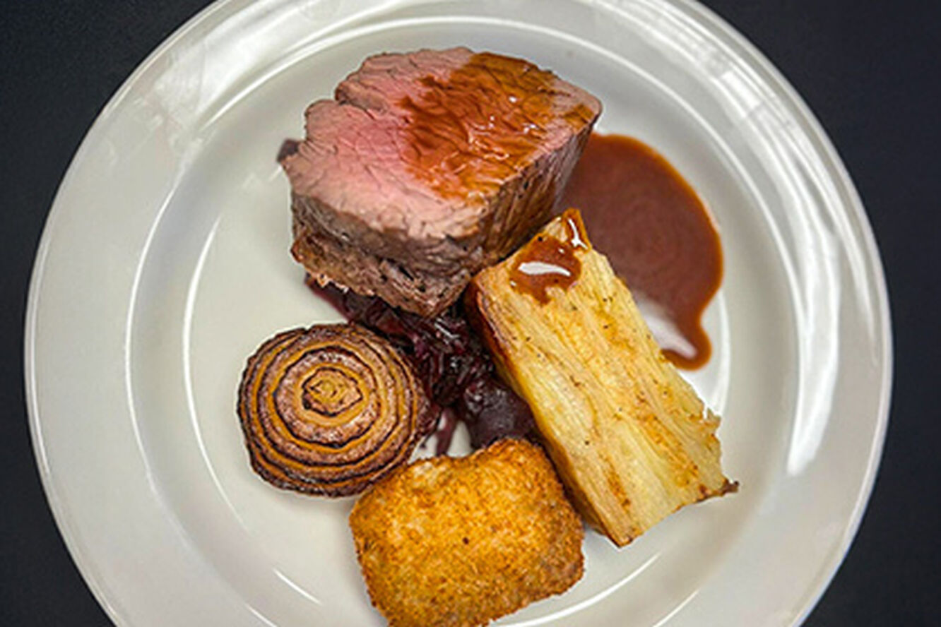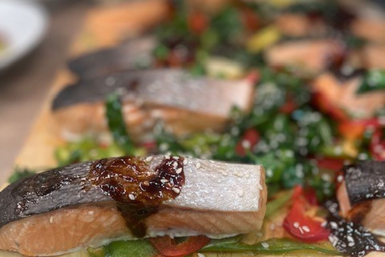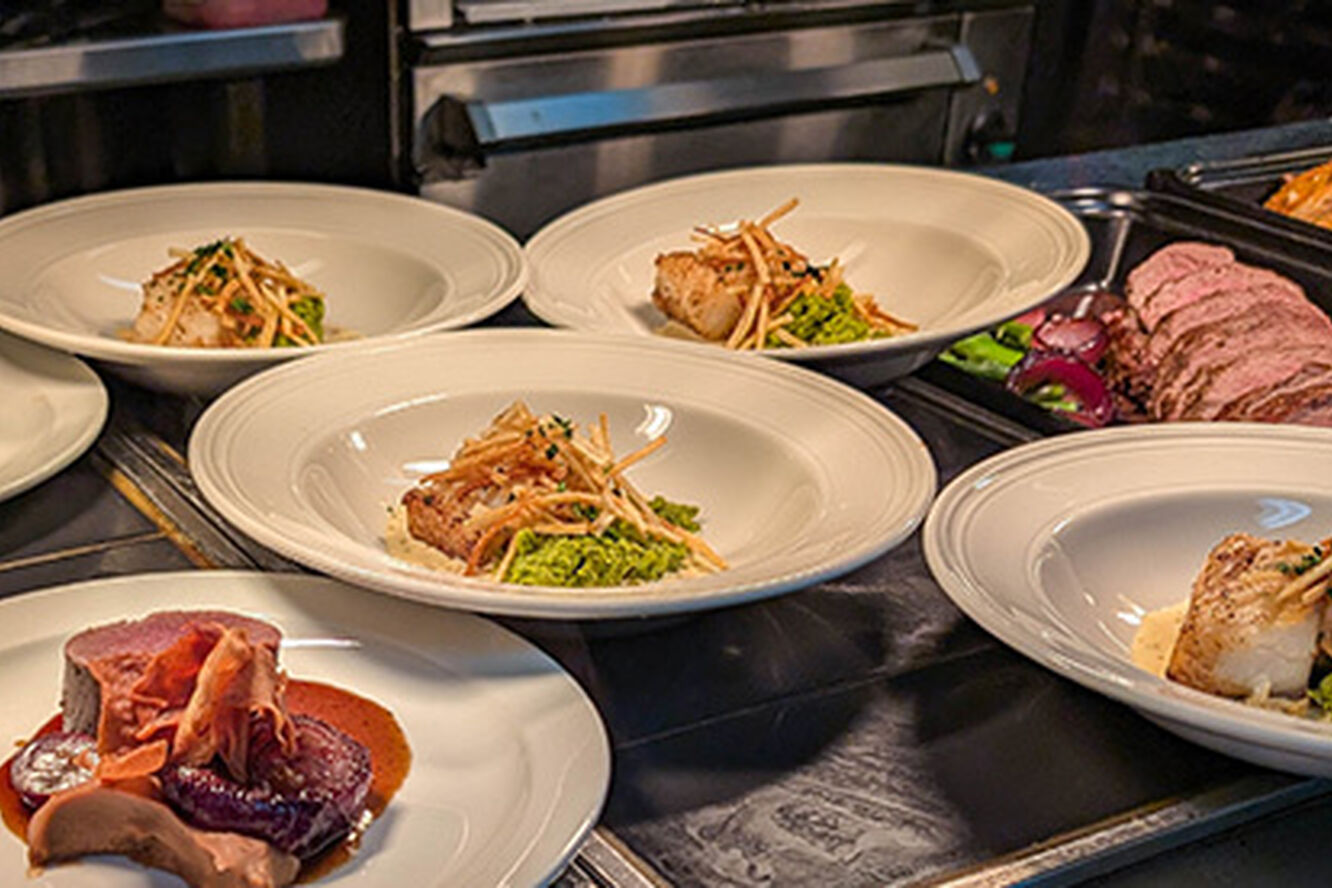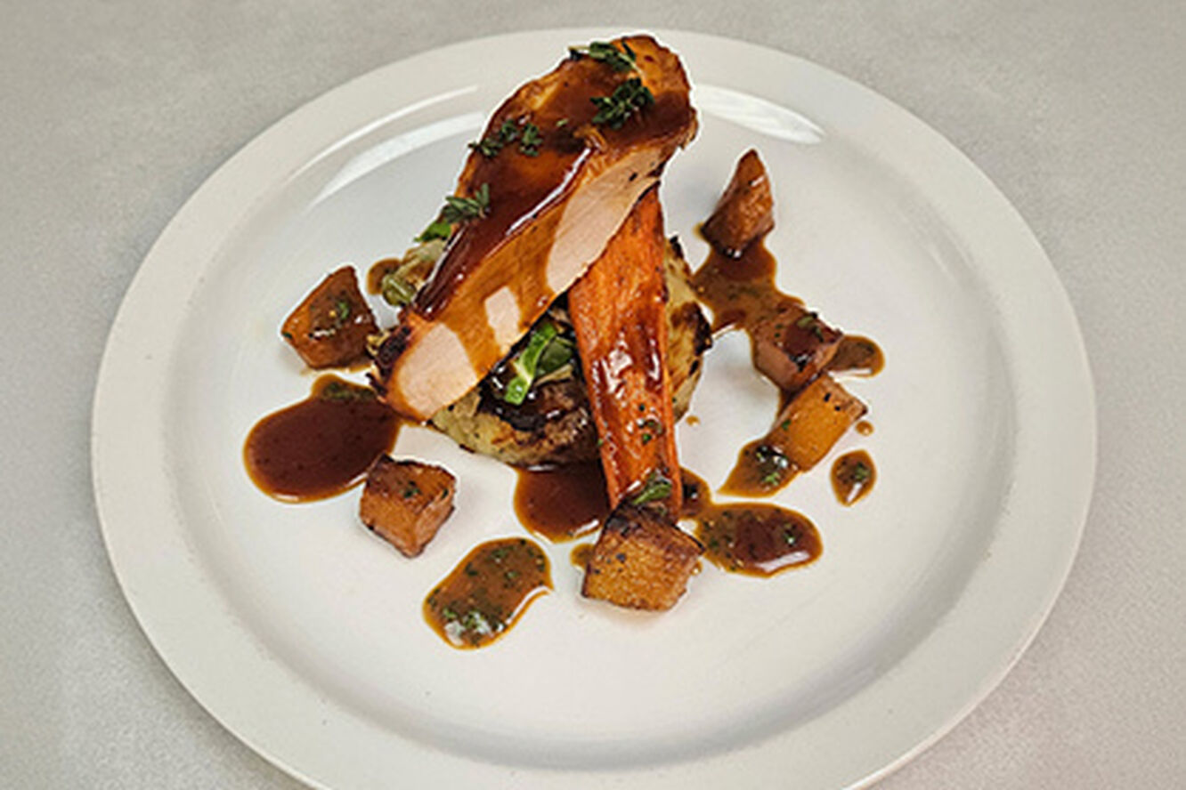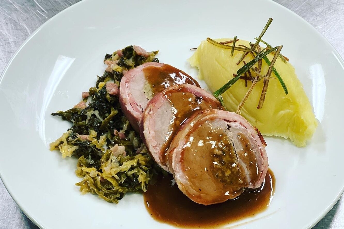 02 Brined cod on a bed of crushed new potatoes and spinach pickled radish pea puree lemon and parsley oil