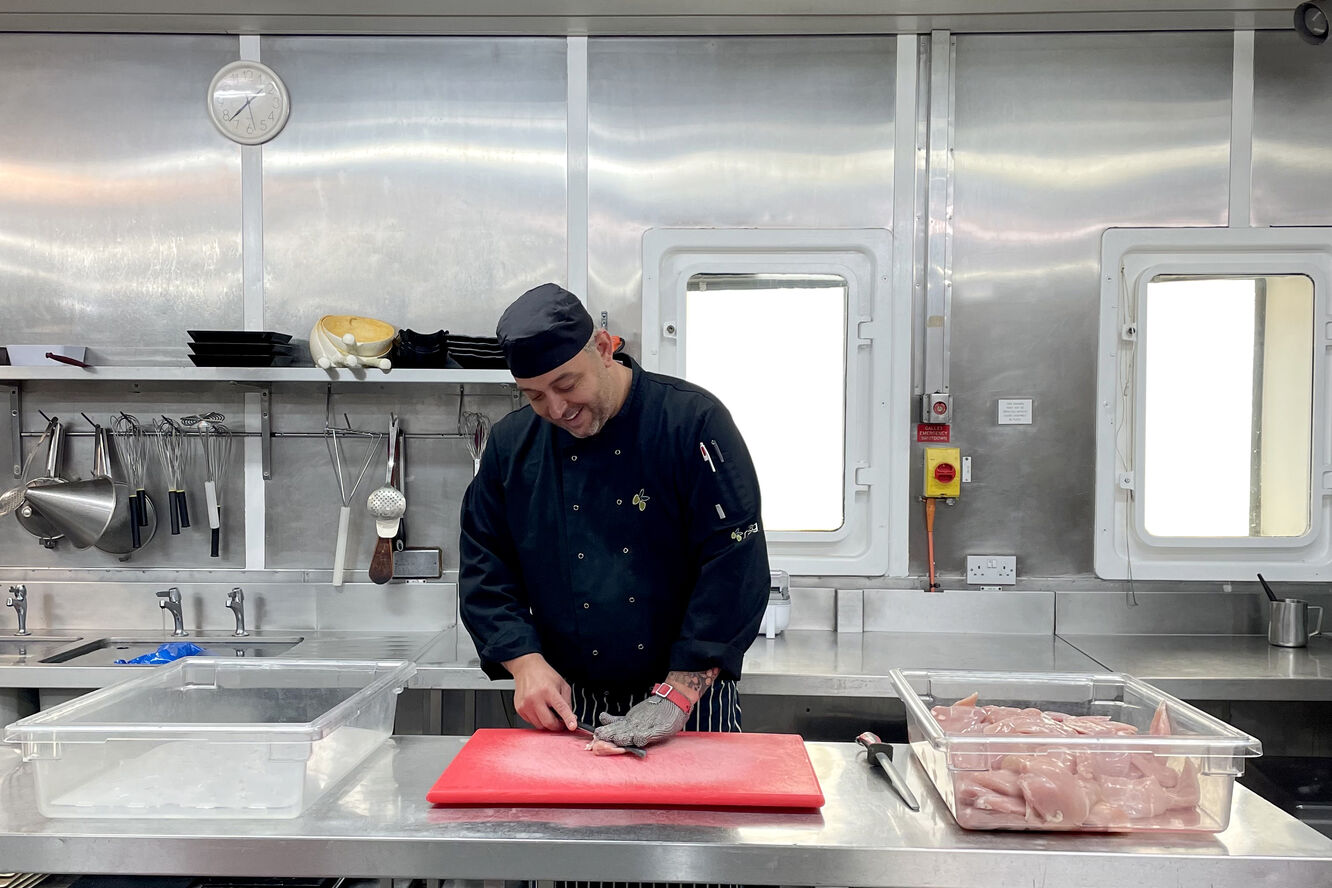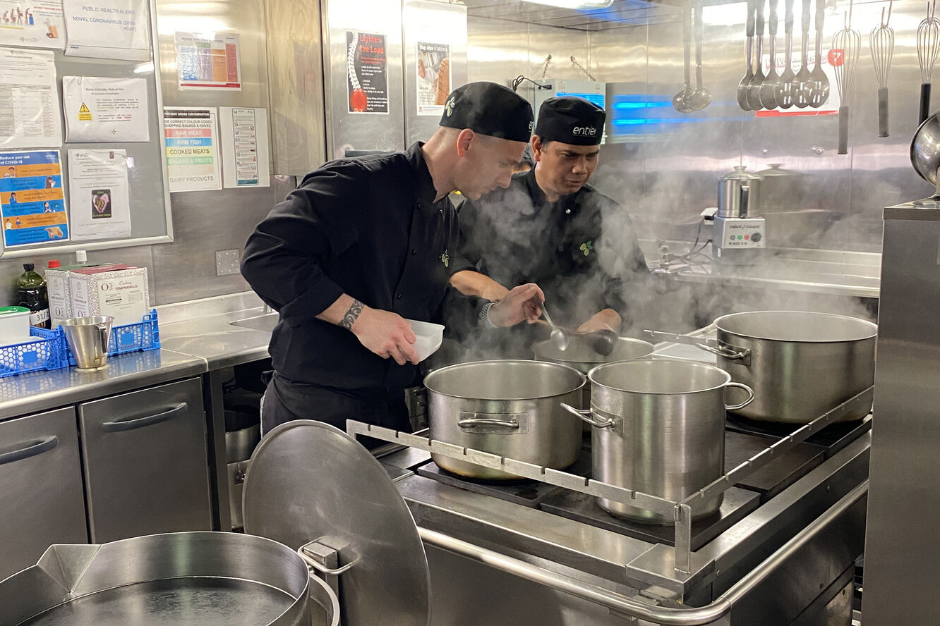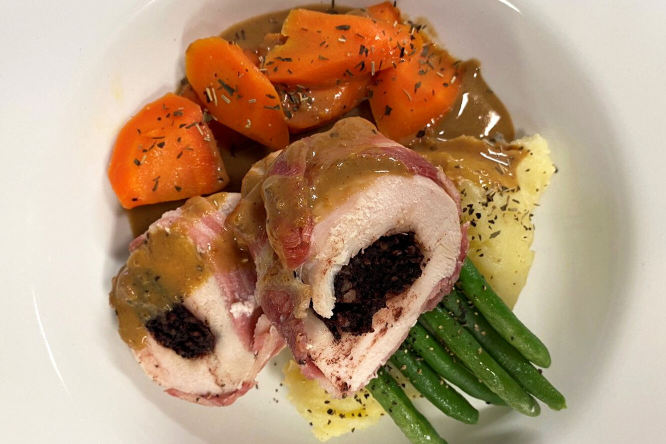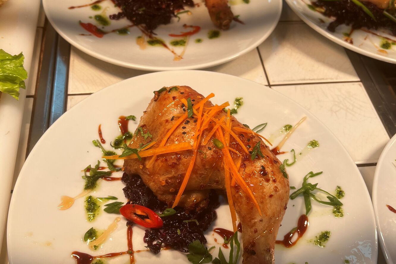 02 Brined cod on a bed of crushed new potatoes and spinach pickled radish pea puree lemon and parsley oil